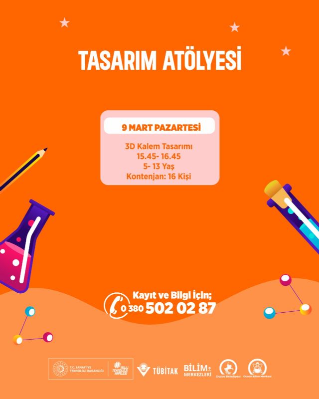 9 Mart Pazartesi günü 15.45 – 16.45 saatleri arası 5-13 yaş (3D Kalem Tasarımı)