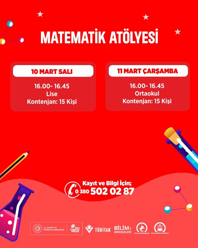 Düzce Belediyesi Bilim Merkezi Mart ayı ikinci hafta atölyelerinin tarihleri ve detayları belli oldu. Yaş grubu ve ilgi alanlarına göre tamamen ücretsiz olarak düzenlenen ve haftalık oluşturulacak derslerle her seans için belirli kontenjanların oluşturulduğu atölyeler şu şekilde;